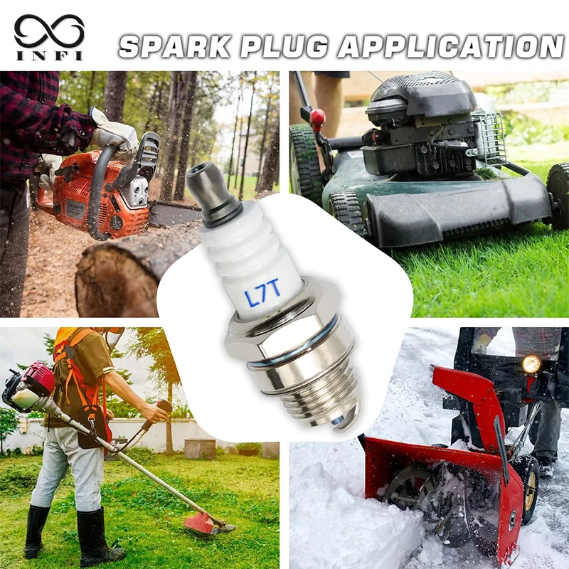 2 bujías L7T para motores de 2 tiempos de 33-49 cc. Compatibles con motosierras, cortacéspedes, cortasetos, desbrozadoras, minicortacéspedes y bicicletas.