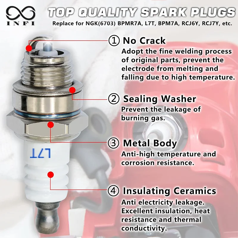 Diseñado para reemplazar NGK BPM7A, Champion CJ6Y/CJ7Y, Bosch WSR6F y Echo 15901713930. Ajuste garantizado para motores de 2 tiempos de 33 cc, 43 cc, 47 cc y 49 cc.
