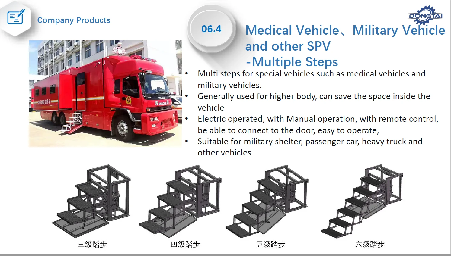 Escalones para vehículos recreativos, vehículos médicos y vehículos militares.