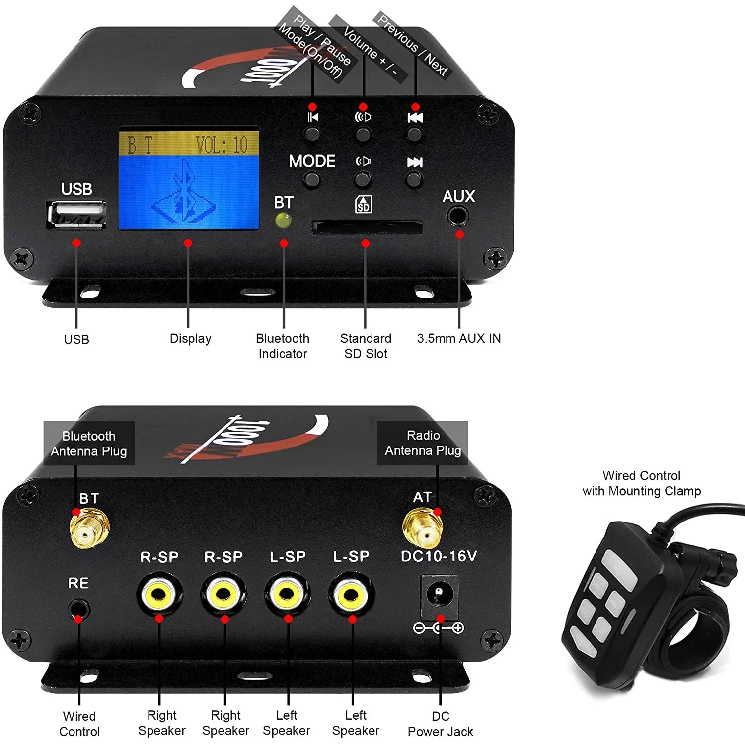 1000W 4CH Multmedia Power Amplifier with Bluetooth, FM Radio, USB, AUX, SD Card, Compact Audio Player for Cars, Motorcycles etc.