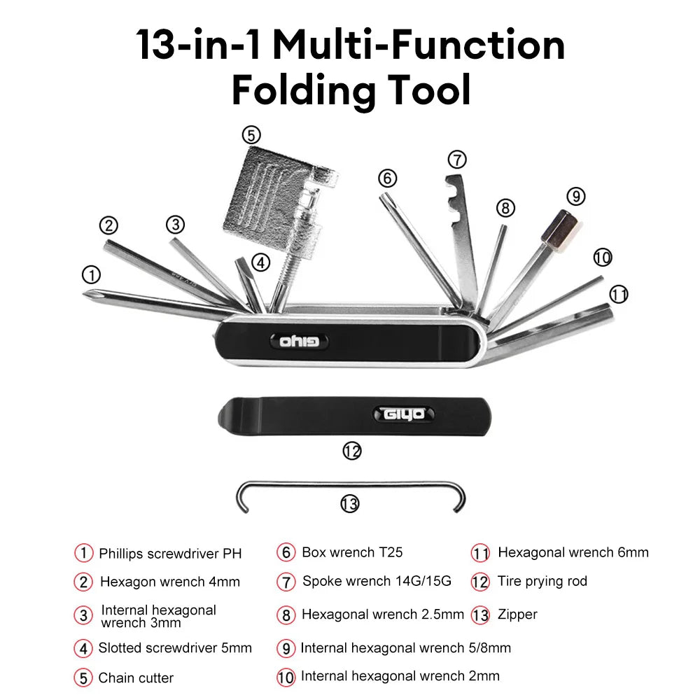1.Cross screwdriver PH1/2. Hexagon wrench 4mm/3. Hexagon wrench 3mm/4. Slotted screwdriver 5mm/5. Chain cutter/6. Box wrench T25/7. Spoke wrench 14G/15G/8. Hexagon wrench 2.5mm/9. Hexagon wrench 5/8mm/10. Hexagon wrench 2mm/11. Hexagon wrench 6mm/12. Tire prying rod/13. Zipper