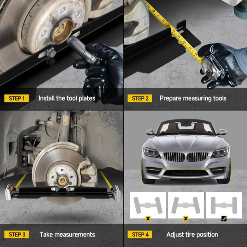 1. Medición de precisión: Retire el neumático y monte nuestra herramienta de alineación de ruedas de acero inoxidable en el cubo de la rueda para obtener una medición precisa del ángulo de convergencia.