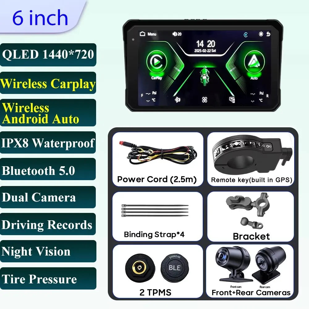 6 inch Motorcycle Navigation Incell Screen 1440*720 Wireless CarPlay Android Auto Motorcycle GPS Motor DVR Monitor TPMS Optional