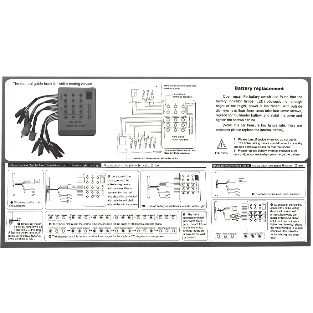 1. Motor coil detection: Connect the three clips on the motor coil end of the detector to the three thick wires of the motor and turn the motor. The three signal lights flash in turn, which is normal. If any one does not light up, then this winding is faulty.