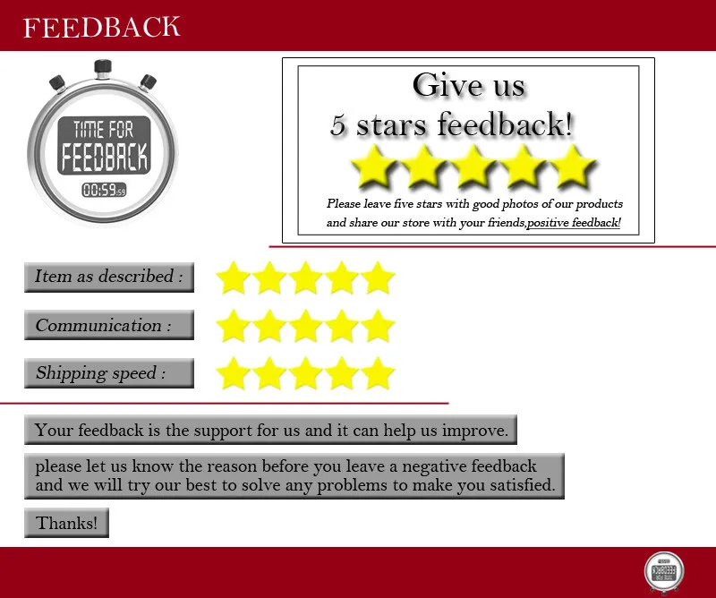 We hope our buyers will contact us firstly before leaving a negative/neutral feedback.