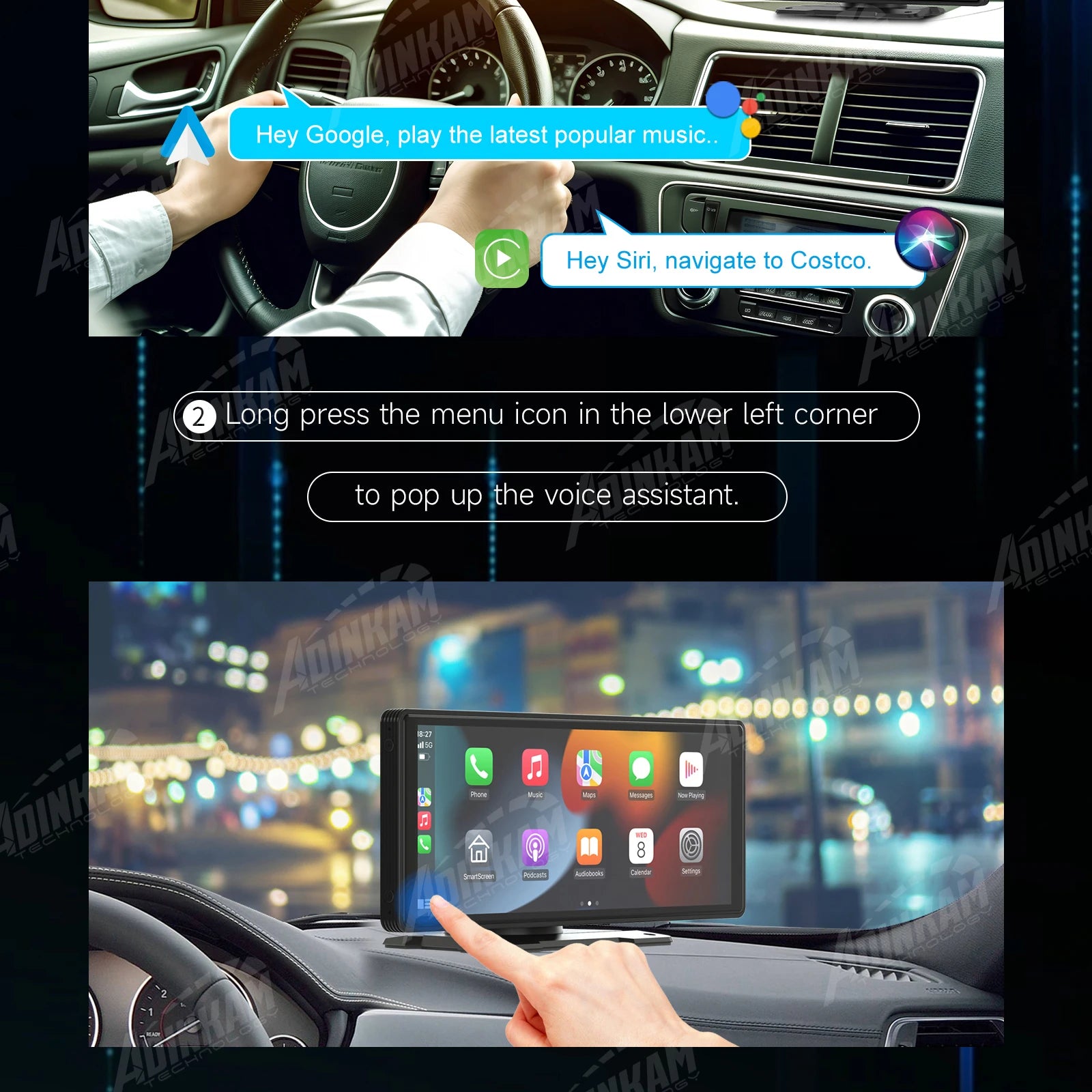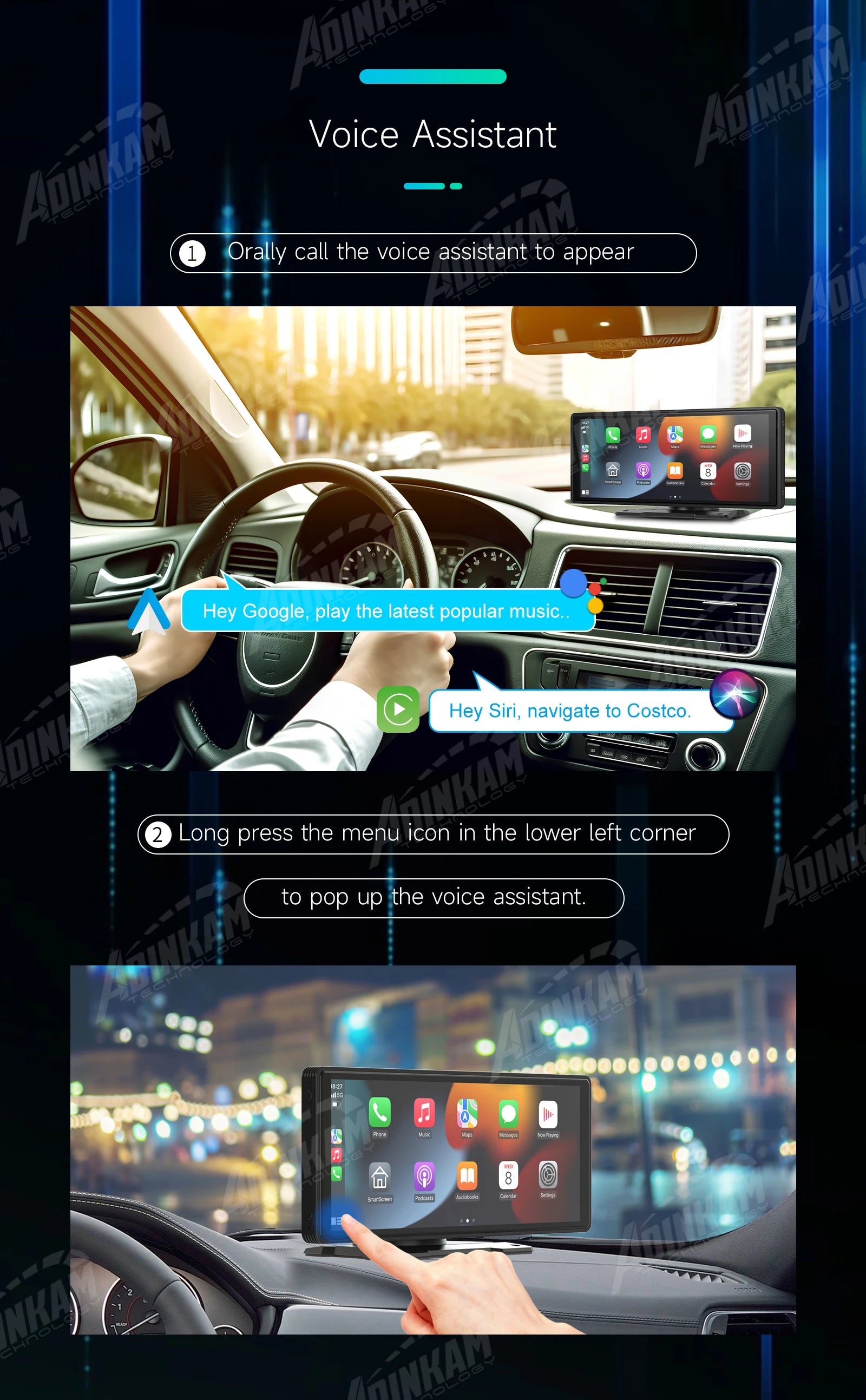 Puedes usar el asistente de voz de tu teléfono para completar las funciones mencionadas, lo que evita el comportamiento peligroso de usar el teléfono al conducir. El asistente de voz llama a Siri con Carplay o a Google con Android Auto. Si el volumen es demasiado alto, como al reproducir música, puedes activar manualmente el asistente de voz manteniendo pulsada la esquina inferior izquierda de la página de funciones Carplay/Android Auto.