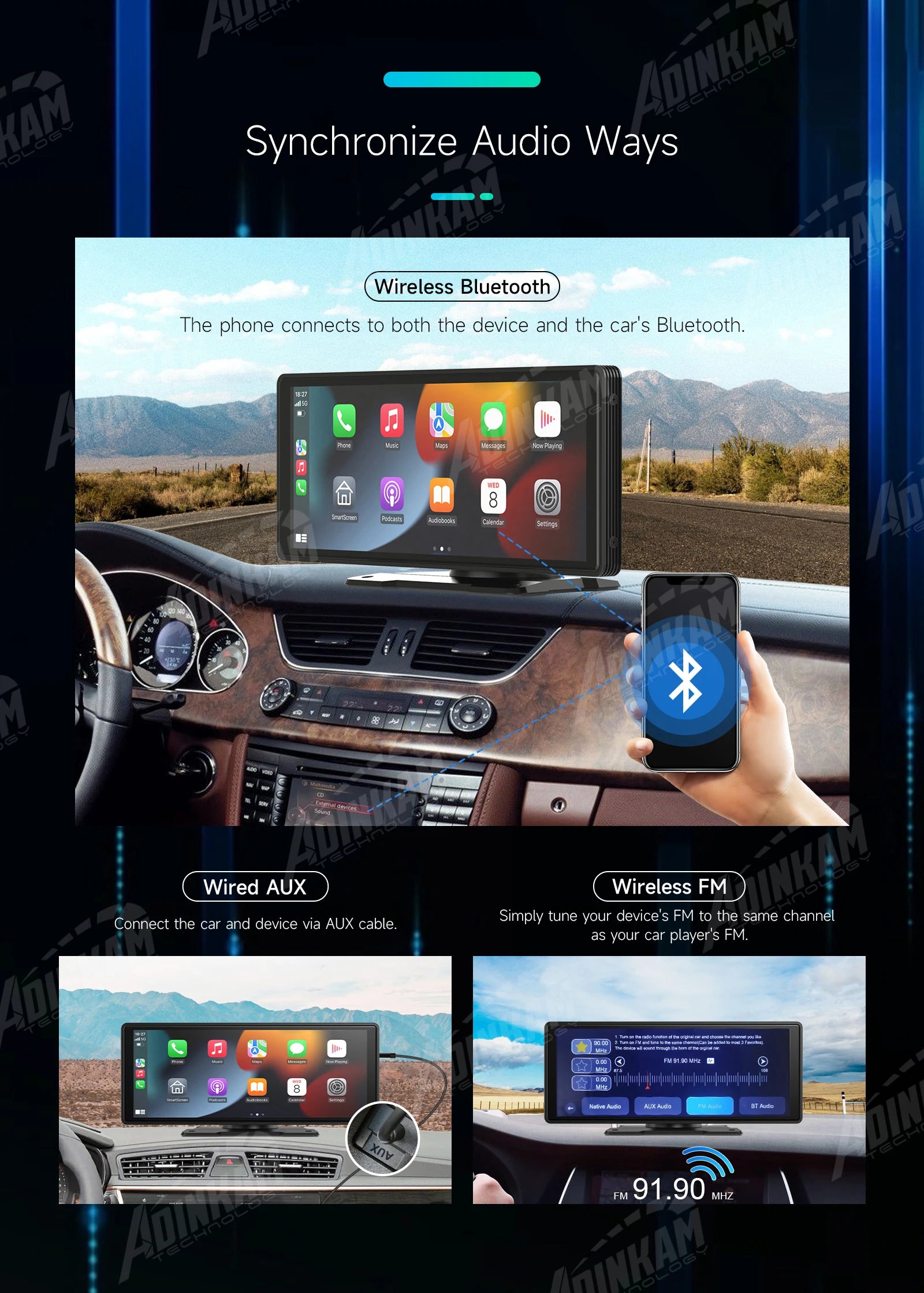 AUX - La máquina sincroniza el sonido del teléfono móvil y el reproductor del automóvil a través de FM inalámbrica, y también puede sincronizarse a través de AUX con cable, este último es más estable.