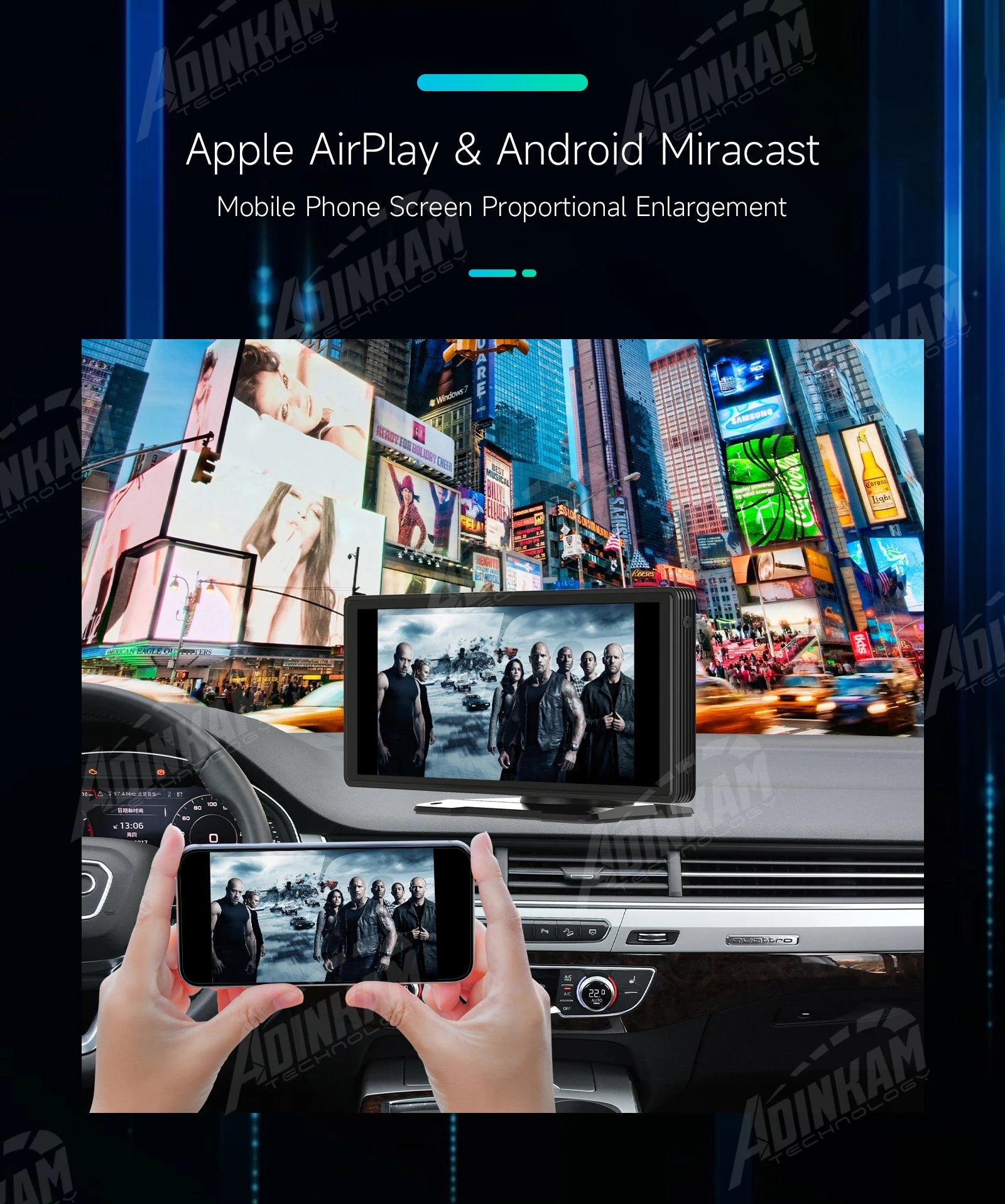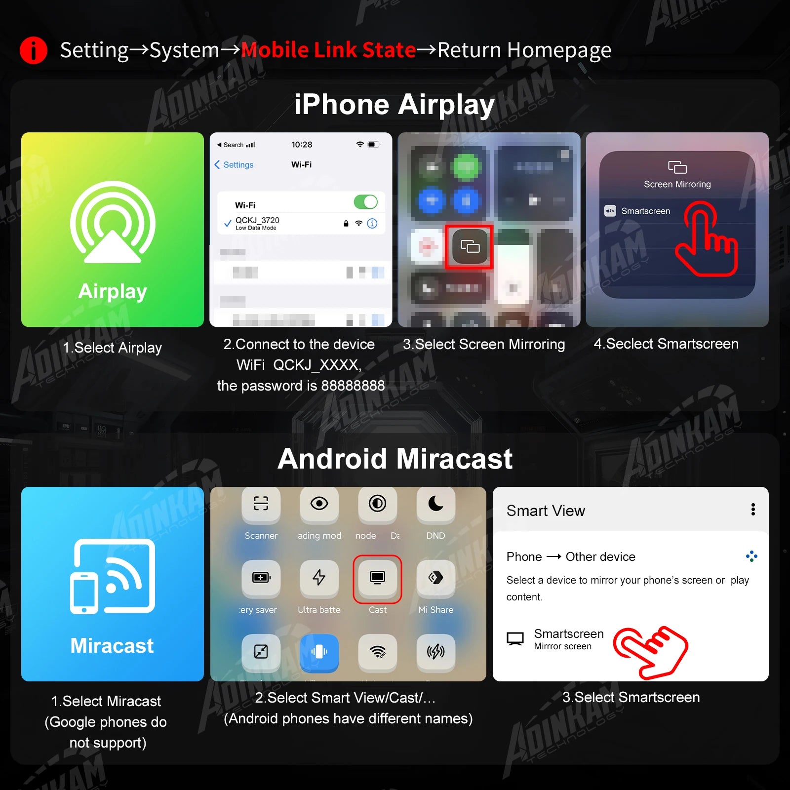 El producto es compatible con Apple AirPlay y Android Miracast mediante la conexión wifi del teléfono móvil. En este modo, se puede proyectar la pantalla del teléfono y ampliar la página en la misma proporción. Tenga en cuenta que el dispositivo no puede controlar la página del teléfono en este modo.