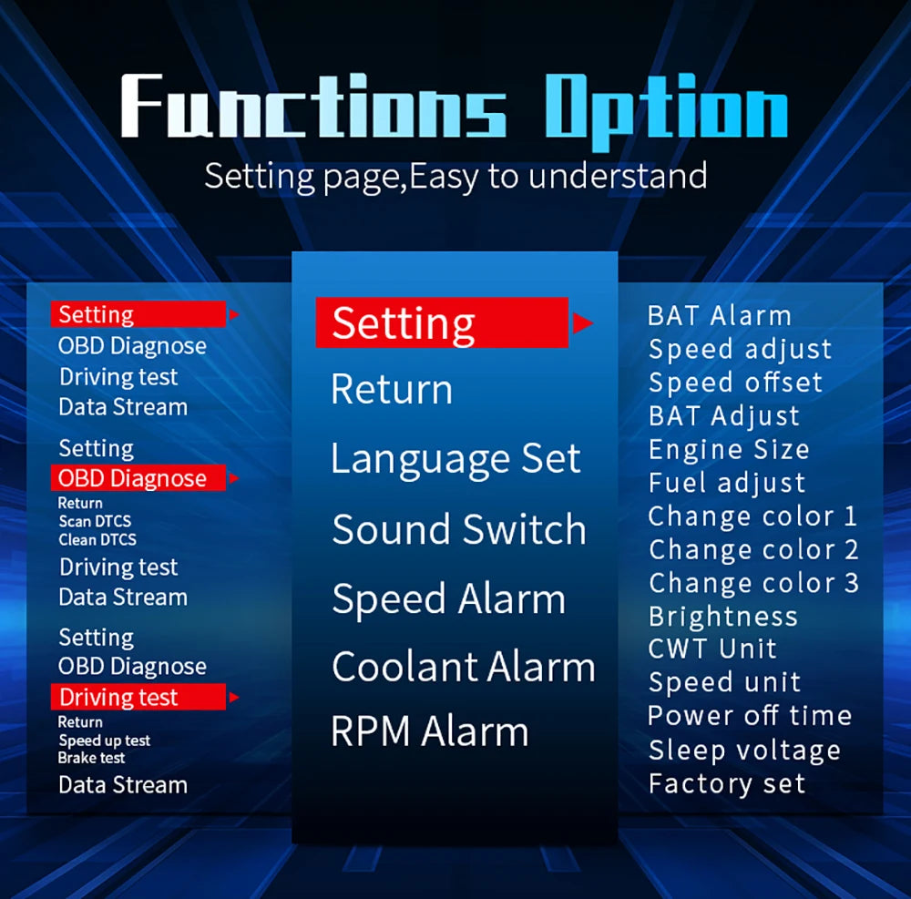 7. Rich Contents:vehicle speed,engine RPM,water temperature,voltage,instantaneous fuel consumption,average fuel consumption,driving distance measurement,driving time ,low voltage alarm,high water temperature alarm,over speed alarm, engine fault code alarm, eliminate the fault code,freely switch between kilometers&miles.