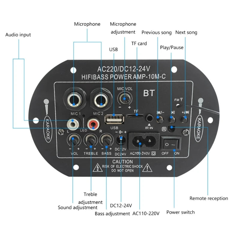 Equipped with wireless BT, radio, memory card / USB audios Suitable for installation: 8"/10" subwoofer or speaker.